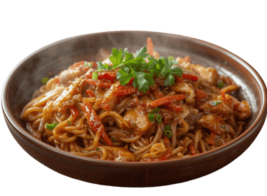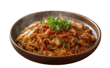 Fideos de arroz mas 3 carnes salteadas en salsa de Ostra $12.000